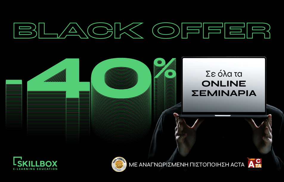 Η φετινή Black Offer του Skillbox.gr φέρνει τη μεγαλύτερη ευκαιρία εκπαίδευσης της χρονιάς, προσφέροντας 40% έκπτωση σε όλα τα σεμινάρια μέχρι τις 30/11. Με μια μεγάλη ποικιλία προγραμμάτων σε σύγχρονους τομείς και πλήρη ευελιξία παρακολούθησης, η προσφορά αυτή δίνει σε κάθε ενδιαφερόμενο τη δυνατότητα να αναβαθμίσει τις δεξιότητές του, να ενισχύσει το βιογραφικό του και να κάνει ένα καθοριστικό βήμα στην επαγγελματική του εξέλιξη στην καλύτερη δυνατή τιμή!